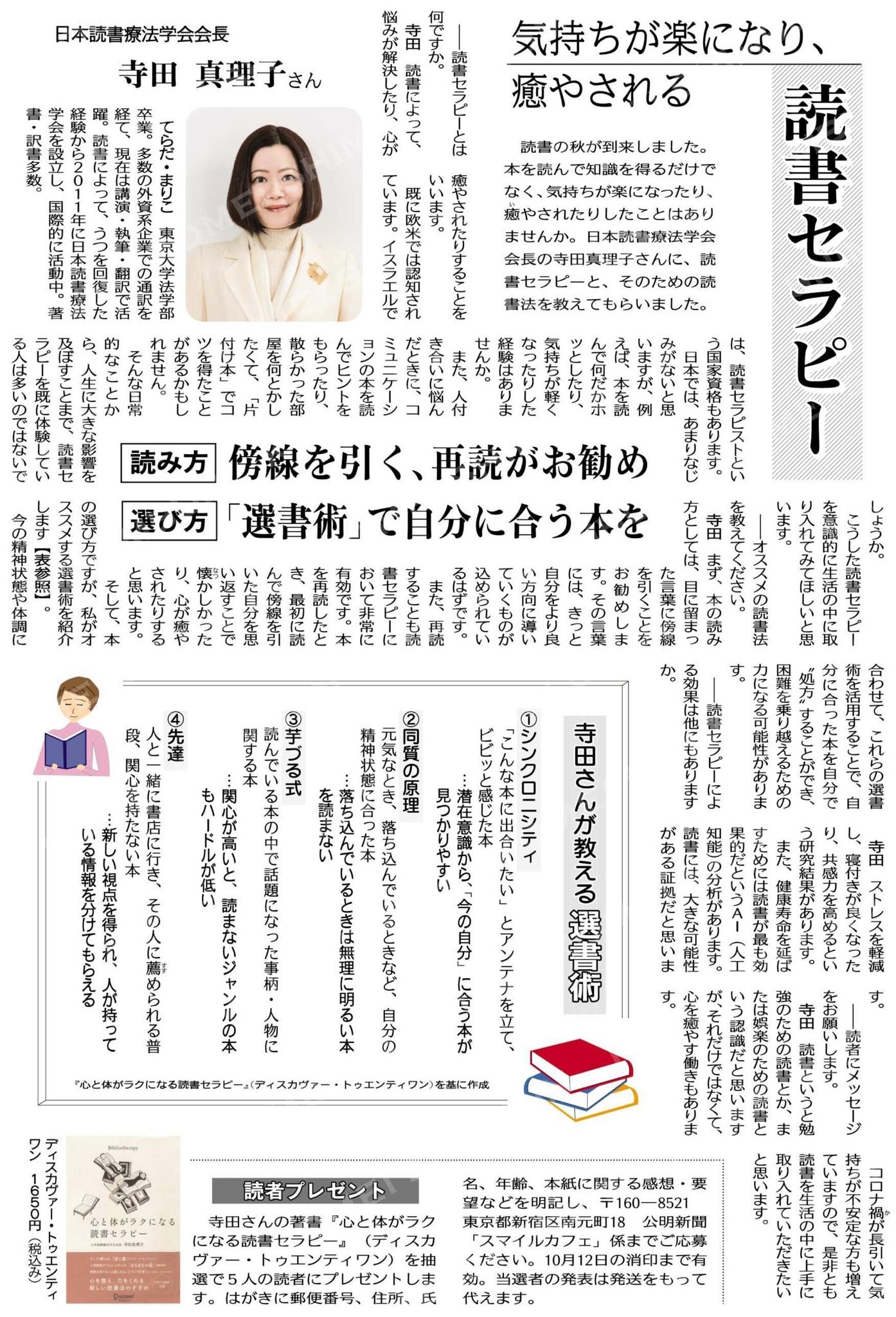 公明新聞に会長の取材記事「読書セラピー」が掲載されました。 - 2021年10月1日